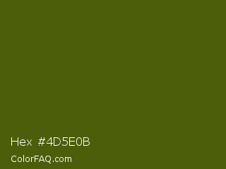 Hex #4d5e0b Color is a very dark lime color and the nearest color is Saratoga #555b10. Hex code #4d5e0b and RGB value is rgb(77,94,11). In RGB color space, this color is composed of 30% red, 37% green, 4% blue, In CMYK color space, this color is composed of 18% cyan, 0% magenta, 88% yellow , 63% black , In HSL color space, this color has a hue angle of 72° , 79% saturation and 21% lightness.