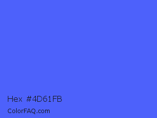 Hex #4d61fb Color is a light blue color and the nearest color is Ultramarine Blue #4166f5. Hex code #4d61fb and RGB value is rgb(77,97,251). In RGB color space, this color is composed of 30% red, 38% green, 98% blue, In CMYK color space, this color is composed of 69% cyan, 61% magenta, 0% yellow , 2% black , In HSL color space, this color has a hue angle of 233° , 96% saturation and 64% lightness.