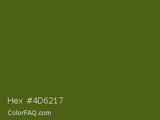 Hex #4d6217 Color is a dark lime color and the nearest color is Saratoga #555b10. Hex code #4d6217 and RGB value is rgb(77,98,23). In RGB color space, this color is composed of 30% red, 38% green, 9% blue, In CMYK color space, this color is composed of 21% cyan, 0% magenta, 77% yellow , 62% black , In HSL color space, this color has a hue angle of 77° , 62% saturation and 24% lightness.