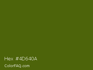 Hex #4d640a Color is a very dark lime color and the nearest color is Green Leaf #436a0d. Hex code #4d640a and RGB value is rgb(77,100,10). In RGB color space, this color is composed of 30% red, 39% green, 4% blue, In CMYK color space, this color is composed of 23% cyan, 0% magenta, 90% yellow , 61% black , In HSL color space, this color has a hue angle of 75° , 82% saturation and 22% lightness.