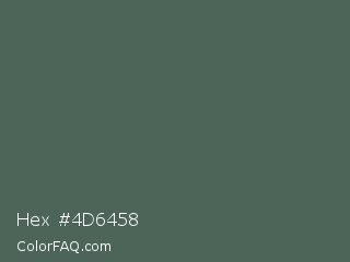 Hex #4d6458 Color is a normal green color and the nearest color is Feldgrau #4d5d53. Hex code #4d6458 and RGB value is rgb(77,100,88). In RGB color space, this color is composed of 30% red, 39% green, 35% blue, In CMYK color space, this color is composed of 23% cyan, 0% magenta, 12% yellow , 61% black , In HSL color space, this color has a hue angle of 149° , 13% saturation and 35% lightness.