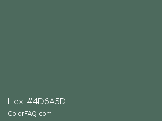 Hex #4d6a5d Color is a normal green color and the nearest color is Finlandia #556d56. Hex code #4d6a5d and RGB value is rgb(77,106,93). In RGB color space, this color is composed of 30% red, 42% green, 36% blue, In CMYK color space, this color is composed of 27% cyan, 0% magenta, 12% yellow , 58% black , In HSL color space, this color has a hue angle of 153° , 16% saturation and 36% lightness.