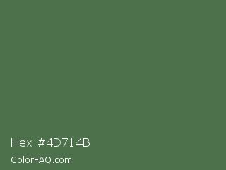 Hex #4d714b Color is a normal green color and the nearest color is Axolotl #4e6649. Hex code #4d714b and RGB value is rgb(77,113,75). In RGB color space, this color is composed of 30% red, 44% green, 29% blue, In CMYK color space, this color is composed of 32% cyan, 0% magenta, 34% yellow , 56% black , In HSL color space, this color has a hue angle of 117° , 20% saturation and 37% lightness.
