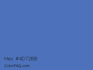 Hex #4d72bb Color is a normal blue color and the nearest color is Indigo #4f69c6. Hex code #4d72bb and RGB value is rgb(77,114,187). In RGB color space, this color is composed of 30% red, 45% green, 73% blue, In CMYK color space, this color is composed of 59% cyan, 39% magenta, 0% yellow , 27% black , In HSL color space, this color has a hue angle of 220° , 45% saturation and 52% lightness.
