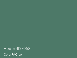 Hex #4d7968 Color is a normal green color and the nearest color is Hookers Green #49796b. Hex code #4d7968 and RGB value is rgb(77,121,104). In RGB color space, this color is composed of 30% red, 47% green, 41% blue, In CMYK color space, this color is composed of 36% cyan, 0% magenta, 14% yellow , 53% black , In HSL color space, this color has a hue angle of 157° , 22% saturation and 39% lightness.