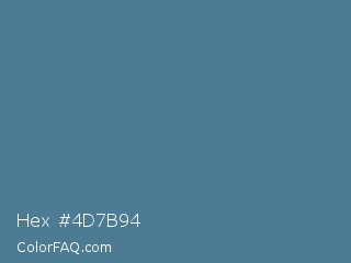 Hex #4d7b94 Color is a normal blue color and the nearest color is Smalt Blue #51808f. Hex code #4d7b94 and RGB value is rgb(77,123,148). In RGB color space, this color is composed of 30% red, 48% green, 58% blue, In CMYK color space, this color is composed of 48% cyan, 17% magenta, 0% yellow , 42% black , In HSL color space, this color has a hue angle of 201° , 32% saturation and 44% lightness.