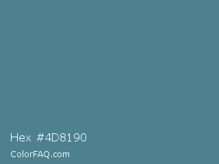 Hex #4d8190 Color is a normal cyan color and the nearest color is Smalt Blue #51808f. Hex code #4d8190 and RGB value is rgb(77,129,144). In RGB color space, this color is composed of 30% red, 51% green, 56% blue, In CMYK color space, this color is composed of 47% cyan, 10% magenta, 0% yellow , 44% black , In HSL color space, this color has a hue angle of 193° , 30% saturation and 43% lightness.