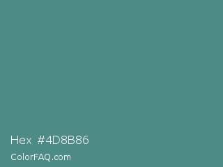 Hex #4d8b86 Color is a normal cyan color and the nearest color is Wintergreen Dream #56887d. Hex code #4d8b86 and RGB value is rgb(77,139,134). In RGB color space, this color is composed of 30% red, 55% green, 53% blue, In CMYK color space, this color is composed of 45% cyan, 0% magenta, 4% yellow , 45% black , In HSL color space, this color has a hue angle of 175° , 29% saturation and 42% lightness.