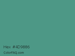 Hex #4d9886 Color is a normal cyan color and the nearest color is Wintergreen Dream #56887d. Hex code #4d9886 and RGB value is rgb(77,152,134). In RGB color space, this color is composed of 30% red, 60% green, 53% blue, In CMYK color space, this color is composed of 49% cyan, 0% magenta, 12% yellow , 40% black , In HSL color space, this color has a hue angle of 166° , 33% saturation and 45% lightness.