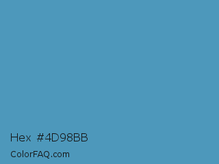 Hex #4d98bb Color is a normal blue color and the nearest color is Hippie Blue #589aaf. Hex code #4d98bb and RGB value is rgb(77,152,187). In RGB color space, this color is composed of 30% red, 60% green, 73% blue, In CMYK color space, this color is composed of 59% cyan, 19% magenta, 0% yellow , 27% black , In HSL color space, this color has a hue angle of 199° , 45% saturation and 52% lightness.