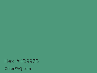 Hex #4d997b Color is a normal green color and the nearest color is Wintergreen Dream #56887d. Hex code #4d997b and RGB value is rgb(77,153,123). In RGB color space, this color is composed of 30% red, 60% green, 48% blue, In CMYK color space, this color is composed of 50% cyan, 0% magenta, 20% yellow , 40% black , In HSL color space, this color has a hue angle of 156° , 33% saturation and 45% lightness.