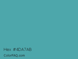 Hex #4da7ab Color is a normal cyan color and the nearest color is Verdigris #43b3ae. Hex code #4da7ab and RGB value is rgb(77,167,171). In RGB color space, this color is composed of 30% red, 65% green, 67% blue, In CMYK color space, this color is composed of 55% cyan, 2% magenta, 0% yellow , 33% black , In HSL color space, this color has a hue angle of 183° , 38% saturation and 49% lightness.