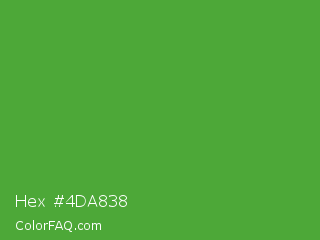 Hex #4da838 Color is a normal green color and the nearest color is Apple #4fa83d. Hex code #4da838 and RGB value is rgb(77,168,56). In RGB color space, this color is composed of 30% red, 66% green, 22% blue, In CMYK color space, this color is composed of 54% cyan, 0% magenta, 67% yellow , 34% black , In HSL color space, this color has a hue angle of 109° , 50% saturation and 44% lightness.