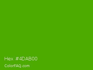 Hex #4dab00 Color is a normal green color and the nearest color is Kelly Green #4cbb17. Hex code #4dab00 and RGB value is rgb(77,171,0). In RGB color space, this color is composed of 30% red, 67% green, 0% blue, In CMYK color space, this color is composed of 55% cyan, 0% magenta, 100% yellow , 33% black , In HSL color space, this color has a hue angle of 93° , 100% saturation and 34% lightness.