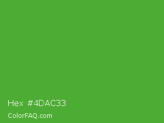 Hex #4dac33 Color is a normal green color and the nearest color is Apple #4fa83d. Hex code #4dac33 and RGB value is rgb(77,172,51). In RGB color space, this color is composed of 30% red, 67% green, 20% blue, In CMYK color space, this color is composed of 55% cyan, 0% magenta, 70% yellow , 33% black , In HSL color space, this color has a hue angle of 107° , 54% saturation and 44% lightness.