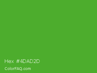 Hex #4dad2d Color is a normal green color and the nearest color is Apple #4fa83d. Hex code #4dad2d and RGB value is rgb(77,173,45). In RGB color space, this color is composed of 30% red, 68% green, 18% blue, In CMYK color space, this color is composed of 55% cyan, 0% magenta, 74% yellow , 32% black , In HSL color space, this color has a hue angle of 105° , 59% saturation and 43% lightness.
