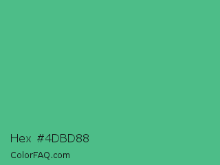 Hex #4dbd88 Color is a normal green color and the nearest color is Ocean Green #48bf91. Hex code #4dbd88 and RGB value is rgb(77,189,136). In RGB color space, this color is composed of 30% red, 74% green, 53% blue, In CMYK color space, this color is composed of 59% cyan, 0% magenta, 28% yellow , 26% black , In HSL color space, this color has a hue angle of 152° , 46% saturation and 52% lightness.
