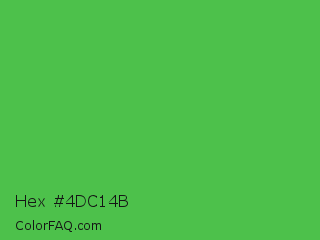 Hex #4dc14b Color is a normal green color and the nearest color is Apple #4fa83d. Hex code #4dc14b and RGB value is rgb(77,193,75). In RGB color space, this color is composed of 30% red, 76% green, 29% blue, In CMYK color space, this color is composed of 60% cyan, 0% magenta, 61% yellow , 24% black , In HSL color space, this color has a hue angle of 119° , 49% saturation and 53% lightness.