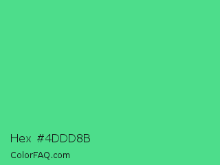 Hex #4ddd8b Color is a normal green color and the nearest color is Very Light Malachite Green #64e986. Hex code #4ddd8b and RGB value is rgb(77,221,139). In RGB color space, this color is composed of 30% red, 87% green, 55% blue, In CMYK color space, this color is composed of 65% cyan, 0% magenta, 37% yellow , 13% black , In HSL color space, this color has a hue angle of 146° , 68% saturation and 58% lightness.