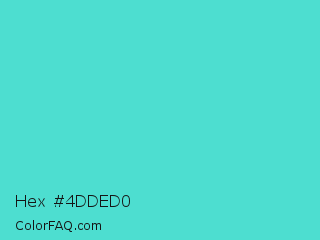 Hex #4dded0 Color is a normal cyan color and the nearest color is Turquoise #40e0d0. Hex code #4dded0 and RGB value is rgb(77,222,208). In RGB color space, this color is composed of 30% red, 87% green, 82% blue, In CMYK color space, this color is composed of 65% cyan, 0% magenta, 6% yellow , 13% black , In HSL color space, this color has a hue angle of 174° , 69% saturation and 59% lightness.