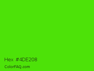 Hex #4de208 Color is a normal green color and the nearest color is Harlequin Green #46cb18. Hex code #4de208 and RGB value is rgb(77,226,8). In RGB color space, this color is composed of 30% red, 89% green, 3% blue, In CMYK color space, this color is composed of 66% cyan, 0% magenta, 96% yellow , 11% black , In HSL color space, this color has a hue angle of 101° , 93% saturation and 46% lightness.