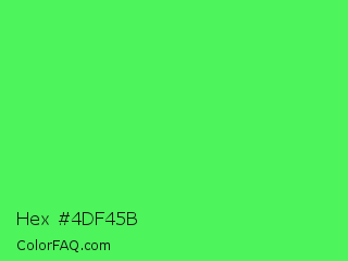 Hex #4df45b Color is a light green color and the nearest color is Screamin Green #66ff66. Hex code #4df45b and RGB value is rgb(77,244,91). In RGB color space, this color is composed of 30% red, 96% green, 36% blue, In CMYK color space, this color is composed of 68% cyan, 0% magenta, 63% yellow , 4% black , In HSL color space, this color has a hue angle of 125° , 88% saturation and 63% lightness.
