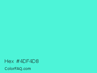 Hex #4df4d8 Color is a light cyan color and the nearest color is Turquoise #40e0d0. Hex code #4df4d8 and RGB value is rgb(77,244,216). In RGB color space, this color is composed of 30% red, 96% green, 85% blue, In CMYK color space, this color is composed of 68% cyan, 0% magenta, 11% yellow , 4% black , In HSL color space, this color has a hue angle of 170° , 88% saturation and 63% lightness.