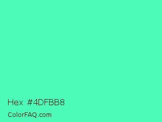 Hex #4dfbb8 Color is a light green color and the nearest color is Turquoise #40e0d0. Hex code #4dfbb8 and RGB value is rgb(77,251,184). In RGB color space, this color is composed of 30% red, 98% green, 72% blue, In CMYK color space, this color is composed of 69% cyan, 0% magenta, 27% yellow , 2% black , In HSL color space, this color has a hue angle of 157° , 96% saturation and 64% lightness.