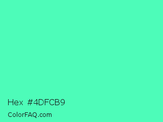 Hex #4dfcb9 Color is a light green color and the nearest color is Turquoise #40e0d0. Hex code #4dfcb9 and RGB value is rgb(77,252,185). In RGB color space, this color is composed of 30% red, 99% green, 73% blue, In CMYK color space, this color is composed of 69% cyan, 0% magenta, 27% yellow , 1% black , In HSL color space, this color has a hue angle of 157° , 97% saturation and 65% lightness.