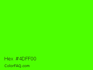 Hex #4dff00 Color is a normal green color and the nearest color is Chlorophyll Green #4aff00. Hex code #4dff00 and RGB value is rgb(77,255,0). In RGB color space, this color is composed of 30% red, 100% green, 0% blue, In CMYK color space, this color is composed of 70% cyan, 0% magenta, 100% yellow , 0% black , In HSL color space, this color has a hue angle of 102° , 100% saturation and 50% lightness.