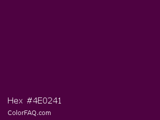 Hex #4e0241 Color is a very dark magenta color and the nearest color is Loulou #460b41. Hex code #4e0241 and RGB value is rgb(78,2,65). In RGB color space, this color is composed of 31% red, 1% green, 25% blue, In CMYK color space, this color is composed of 0% cyan, 97% magenta, 17% yellow , 69% black , In HSL color space, this color has a hue angle of 310° , 95% saturation and 16% lightness.