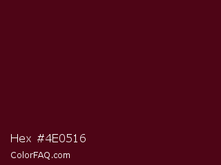 Hex #4e0516 Color is a very dark red color and the nearest color is Cab Sav #4d0a18. Hex code #4e0516 and RGB value is rgb(78,5,22). In RGB color space, this color is composed of 31% red, 2% green, 9% blue, In CMYK color space, this color is composed of 0% cyan, 94% magenta, 72% yellow , 69% black , In HSL color space, this color has a hue angle of 346° , 88% saturation and 16% lightness.