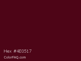 Hex #4e0517 Color is a very dark red color and the nearest color is Cab Sav #4d0a18. Hex code #4e0517 and RGB value is rgb(78,5,23). In RGB color space, this color is composed of 31% red, 2% green, 9% blue, In CMYK color space, this color is composed of 0% cyan, 94% magenta, 71% yellow , 69% black , In HSL color space, this color has a hue angle of 345° , 88% saturation and 16% lightness.