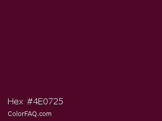 Hex #4e0725 Color is a very dark rose color and the nearest color is Castro #52001f. Hex code #4e0725 and RGB value is rgb(78,7,37). In RGB color space, this color is composed of 31% red, 3% green, 15% blue, In CMYK color space, this color is composed of 0% cyan, 91% magenta, 53% yellow , 69% black , In HSL color space, this color has a hue angle of 335° , 84% saturation and 17% lightness.