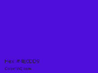 Hex #4e0dd9 Color is a normal indigo color and the nearest color is Interdimensional Blue #360ccc. Hex code #4e0dd9 and RGB value is rgb(78,13,217). In RGB color space, this color is composed of 31% red, 5% green, 85% blue, In CMYK color space, this color is composed of 64% cyan, 94% magenta, 0% yellow , 15% black , In HSL color space, this color has a hue angle of 259° , 89% saturation and 45% lightness.