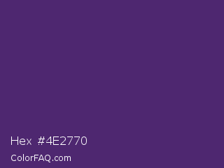 Hex #4e2770 Color is a dark purple color and the nearest color is Honey Flower #4f1c70. Hex code #4e2770 and RGB value is rgb(78,39,112). In RGB color space, this color is composed of 31% red, 15% green, 44% blue, In CMYK color space, this color is composed of 30% cyan, 65% magenta, 0% yellow , 56% black , In HSL color space, this color has a hue angle of 272° , 48% saturation and 30% lightness.