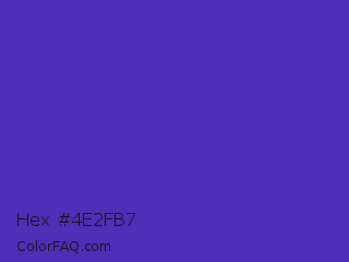 Hex #4e2fb7 Color is a normal indigo color and the nearest color is Ocean Blue #4f42b5. Hex code #4e2fb7 and RGB value is rgb(78,47,183). In RGB color space, this color is composed of 31% red, 18% green, 72% blue, In CMYK color space, this color is composed of 57% cyan, 74% magenta, 0% yellow , 28% black , In HSL color space, this color has a hue angle of 254° , 59% saturation and 45% lightness.