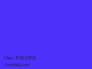 Hex #4e30fb Color is a normal indigo color and the nearest color is Han Purple #5218fa. Hex code #4e30fb and RGB value is rgb(78,48,251). In RGB color space, this color is composed of 31% red, 19% green, 98% blue, In CMYK color space, this color is composed of 69% cyan, 81% magenta, 0% yellow , 2% black , In HSL color space, this color has a hue angle of 249° , 96% saturation and 59% lightness.