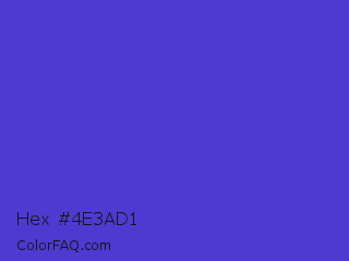 Hex #4e3ad1 Color is a normal indigo color and the nearest color is Iris #5a4fcf. Hex code #4e3ad1 and RGB value is rgb(78,58,209). In RGB color space, this color is composed of 31% red, 23% green, 82% blue, In CMYK color space, this color is composed of 63% cyan, 72% magenta, 0% yellow , 18% black , In HSL color space, this color has a hue angle of 248° , 62% saturation and 52% lightness.