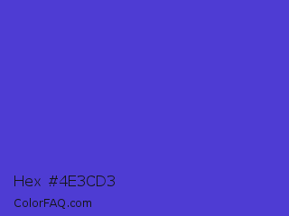 Hex #4e3cd3 Color is a normal indigo color and the nearest color is Iris #5a4fcf. Hex code #4e3cd3 and RGB value is rgb(78,60,211). In RGB color space, this color is composed of 31% red, 24% green, 83% blue, In CMYK color space, this color is composed of 63% cyan, 72% magenta, 0% yellow , 17% black , In HSL color space, this color has a hue angle of 247° , 63% saturation and 53% lightness.