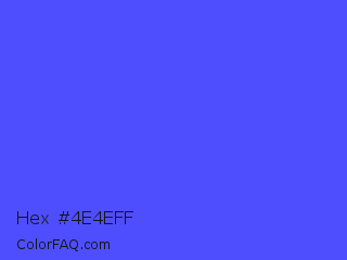 Hex #4e4eff Color is a light blue color and the nearest color is Ultramarine Blue #4166f5. Hex code #4e4eff and RGB value is rgb(78,78,255). In RGB color space, this color is composed of 31% red, 31% green, 100% blue, In CMYK color space, this color is composed of 69% cyan, 69% magenta, 0% yellow , 0% black , In HSL color space, this color has a hue angle of 240° , 100% saturation and 65% lightness.