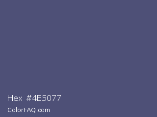 Hex #4e5077 Color is a normal blue color and the nearest color is Purple Navy #4e5180. Hex code #4e5077 and RGB value is rgb(78,80,119). In RGB color space, this color is composed of 31% red, 31% green, 47% blue, In CMYK color space, this color is composed of 34% cyan, 33% magenta, 0% yellow , 53% black , In HSL color space, this color has a hue angle of 237° , 21% saturation and 39% lightness.