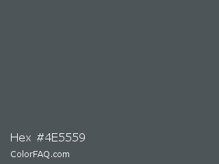 Hex #4e5559 Color is a normal blue color and the nearest color is Abbey #4c4f56. Hex code #4e5559 and RGB value is rgb(78,85,89). In RGB color space, this color is composed of 31% red, 33% green, 35% blue, In CMYK color space, this color is composed of 12% cyan, 4% magenta, 0% yellow , 65% black , In HSL color space, this color has a hue angle of 202° , 7% saturation and 33% lightness.