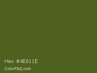 Hex #4e611e Color is a dark lime color and the nearest color is Dark Moss Green #4a5d23. Hex code #4e611e and RGB value is rgb(78,97,30). In RGB color space, this color is composed of 31% red, 38% green, 12% blue, In CMYK color space, this color is composed of 20% cyan, 0% magenta, 69% yellow , 62% black , In HSL color space, this color has a hue angle of 77° , 53% saturation and 25% lightness.
