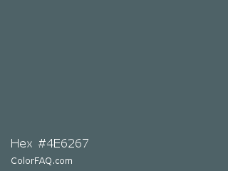 Hex #4e6267 Color is a normal cyan color and the nearest color is Stormcloud #4f666a. Hex code #4e6267 and RGB value is rgb(78,98,103). In RGB color space, this color is composed of 31% red, 38% green, 40% blue, In CMYK color space, this color is composed of 24% cyan, 5% magenta, 0% yellow , 60% black , In HSL color space, this color has a hue angle of 192° , 14% saturation and 35% lightness.