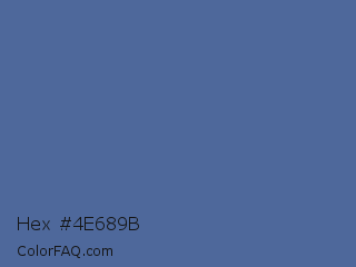 Hex #4e689b Color is a normal blue color and the nearest color is UCLA Blue #536895. Hex code #4e689b and RGB value is rgb(78,104,155). In RGB color space, this color is composed of 31% red, 41% green, 61% blue, In CMYK color space, this color is composed of 50% cyan, 33% magenta, 0% yellow , 39% black , In HSL color space, this color has a hue angle of 220° , 33% saturation and 46% lightness.