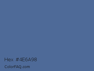 Hex #4e6a98 Color is a normal blue color and the nearest color is UCLA Blue #536895. Hex code #4e6a98 and RGB value is rgb(78,106,152). In RGB color space, this color is composed of 31% red, 42% green, 60% blue, In CMYK color space, this color is composed of 49% cyan, 30% magenta, 0% yellow , 40% black , In HSL color space, this color has a hue angle of 217° , 32% saturation and 45% lightness.