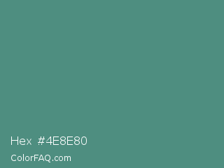 Hex #4e8e80 Color is a normal cyan color and the nearest color is Wintergreen Dream #56887d. Hex code #4e8e80 and RGB value is rgb(78,142,128). In RGB color space, this color is composed of 31% red, 56% green, 50% blue, In CMYK color space, this color is composed of 45% cyan, 0% magenta, 10% yellow , 44% black , In HSL color space, this color has a hue angle of 167° , 29% saturation and 43% lightness.