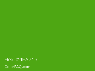 Hex #4ea713 Color is a normal green color and the nearest color is Kelly Green #4cbb17. Hex code #4ea713 and RGB value is rgb(78,167,19). In RGB color space, this color is composed of 31% red, 65% green, 7% blue, In CMYK color space, this color is composed of 53% cyan, 0% magenta, 89% yellow , 35% black , In HSL color space, this color has a hue angle of 96° , 80% saturation and 36% lightness.