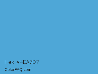 Hex #4ea7d7 Color is a normal blue color and the nearest color is Shakespeare #4eabd1. Hex code #4ea7d7 and RGB value is rgb(78,167,215). In RGB color space, this color is composed of 31% red, 65% green, 84% blue, In CMYK color space, this color is composed of 64% cyan, 22% magenta, 0% yellow , 16% black , In HSL color space, this color has a hue angle of 201° , 63% saturation and 57% lightness.
